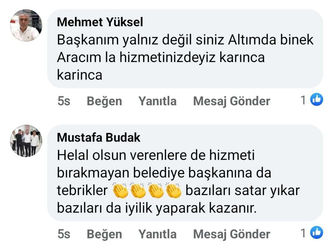 “İhtiyaç varsa 2 tane aracımla emrinizdeyim başkanım” , “Sıkıntı yok, gerekirse vatandaş olarak biz de aracımızı veririz belediyemiz”, “Fatma abla dilerseniz, araç yetersiz olursa benim aracımda hizmetinizdedir”, “Çok yeni bir aracımız yok ama belediyenin hangi bünyesine lazımsa kardeşlerimle beraber hizmetinizdeyiz”, “Sayın başkanım, kiralık araçlarınızı almışlar siz araçları satın alana kadar benim binek aracımı da hemen Belsa’nın önüne getirip bırakabilirim. Yeter ki araçlar alınana kadar mağduriyet yaşamayın”.