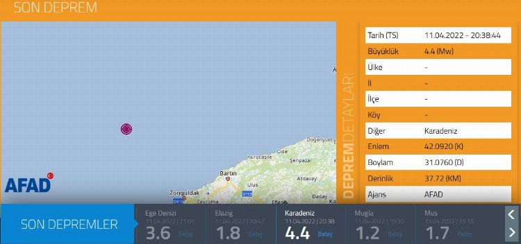 ZONGULDAK (İGFA) - AFAD verilerine göre, Zonguldak açıklarında saat 20.38'de 4,4 büyüklüğünde deprem meydana geldi.