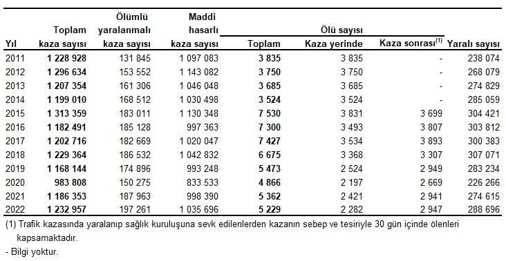 Trafik kazalarında 5 bin 229 kişi hayatını kaybederken 288 bin 696 kişi yaralandığının ortaya çıktığı istatistiki verilerde, Türkiye'de 2022 yılında meydana gelen 197 bin 261 adet ölümlü yaralanmalı trafik kazası sonucunda 2 bin 282 kişi kaza yerinde, 2 bin 947 kişi ise yaralanıp sağlık kuruluşlarına sevk edildikten sonra kazanın sebep ve tesiriyle 30 gün içinde hayatını kaybettiği belirlendi.