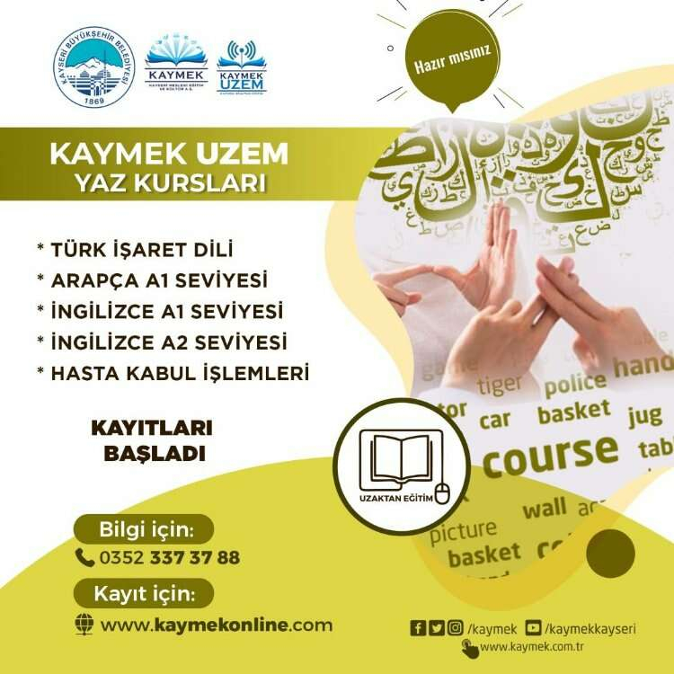 Her zaman kaliteli eğitime etkin bir katkı sunma hedefiyle faaliyetlerini yürüten Büyükşehir Belediyesi, KAYMEK UZEM ile uzakları yakın ediyor. Buna göre dil eğitimi almak isteyen kursiyerler online dersler ile İngilizce A1 Seviyesi, İngilizce A2 Seviyesi, Arapça A1 Seviyesi alabilecekler. Ayrıca, Türk İşaret Dili, Hasta Kabul İşlemleri kursların da kayıtları başladı.