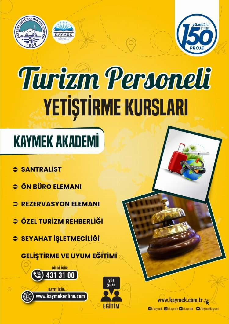 Büyükşehir Belediyesi Kayseri Mesleki Eğitim ve Kültür A.Ş. (KAYMEK), büyük bir turizm potansiyeline sahip olan Kayseri’de sektörün nitelikli eleman ihtiyacını karşılamak amacıyla “150 Yılda 150 Proje” kapsamında “Turizm Personeli Yetiştirme Kursları” düzenliyor. Turizm Personeli Yetiştirme Kursları 4 Temmuz Pazartesi günü başlayacak.