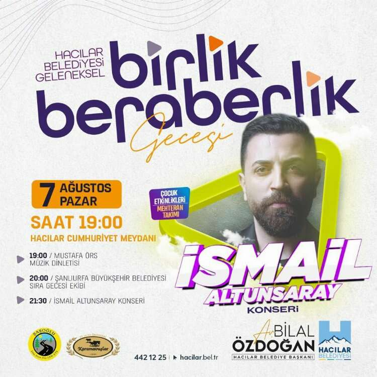 Birlik ve Beraberlik Gecesi’ne tüm Kayseri halkını davet eden Kayseri'nin Hacılar Belediye Başkanı Av. Bilal Özdoğan şöyle konuştu: “Pandemi nedeniyle ara verdiğimiz Birlik ve Beraberlik Gecesi’nin ikincisini inşallah 7 Ağustos Pazar günü saat 19:00’da Hacılar Cumhuriyet Meydanımızda gerçekleştireceğiz. Gecemizde ünlü sanatçı İsmail Altunsaray, Şanlıurfa Büyükşehir Belediyesi Urfa Ahengi Müzik Topluluğu bizlere unutulmaz bir akşam yaşatacak, ayrıca sanatçı Mustafa Örs müzik dinletisiyle bizlere keyifli bir müzik ziyafeti verecek.”
