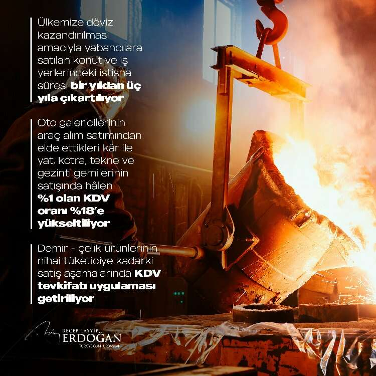 Gönüllülük esasına dayalı tam tevkifat uygulamasıyla bu konuda sorumluluk endişesi taşıyan mükelleflerin sorunlarını kökten çözüyoruz. Ülkemize döviz kazandırılması amacıyla yabancılara satılan konut ve iş yerlerindeki istisna süresini 1 yıldan 3 yıla çıkartıyoruz. Oto galericilerinin araç alım satımından elde ettikleri kar ile yat, kotra, tekne ve gezinti gemilerinin satışında halen yüzde 1 olan KDV oranını yüzde 18'e yükseltiyoruz. Demir çelik ürünlerinin nihai tüketiciye kadarki satış aşamalarında KDV tevkifatı uygulaması getiriyoruz. Tüm bu düzenlemelerin ülkemize hayırlı olmasını diliyorum" dedi.