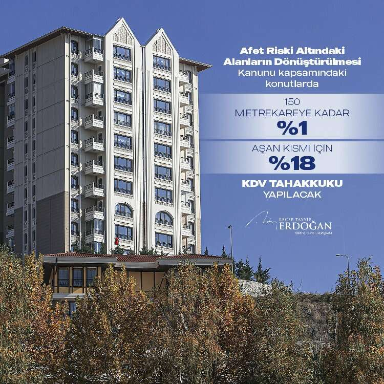 Cumhurbaşkanı Erdoğan, bir diğer çalışmalarının "konut ve arsalarda KDV sadeleştirmesi" olduğunu söyleyerek, "Buna göre, satın alınan konut nerede olursa olsun, metrekaresine göre değişen aynı kademeli KDV uygulamasına tabi olacak. Yani net alanı 150 metrekareyi aşmayan konutlarda KDV yüzde 8'dir. Bu büyüklüğü aşan konutların ilk 150 metrekaresi için yine yüzde 8, aşan kısmı için yüzde 18 KDV uygulanacaktır. Afet Riski Altındaki Alanların Dönüştürülmesi Kanunu kapsamındaki konutlarda ise 150 metrekareye kadar yüzde 1, aşan kısmı için ise yüzde 18 KDV tahakkuku yapılacaktır. Arsa ve arazilerin KDV oranını da yüzde 8'e indirerek inşaat sektörünün üzerindeki finansman yükünü azaltıyoruz" diye konuştu.