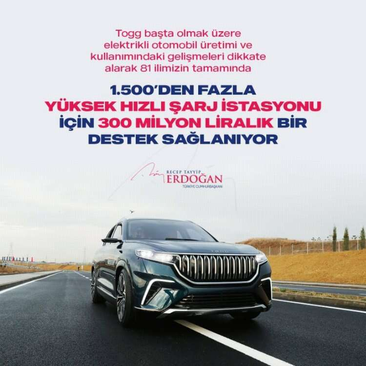 Yerli otomobil Togg başta olmak üzere elektrikli otomobil üretimi ve kullanımındaki gelişmeleri dikkate alarak yüksek hızlı şarj istasyonlarının yaygınlaştırılması konusunda yeni adımlar attıklarını vurgulayan Cumhurbaşkanı Erdoğan, "Sanayi ve Teknoloji Bakanlığımız vasıtasıyla 81 ilimizin tamamında 1500'den fazla yüksek hızlı şarj istasyonu kurulmasına yönelik çalışmalara 300 milyon liralık destek sağlıyoruz. Amacımız bir yıl içinde ülkemizde yaygın bir yüksek hızlı şarj alt yapısı kurulmasını sağlamaktır." dedi.