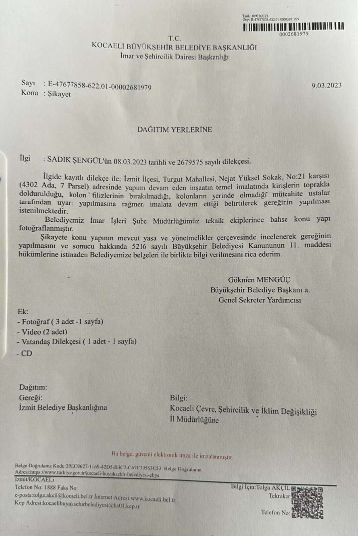 Açıklamada, "Kocaeli Büyükşehir Belediyesi tarafından İzmit Belediyesi’ne ‘’şikayete konu yapının mevcut yasa ve yönetmelikler çerçevesinde incelenerek, gereğinin yapılması ve sonucu hakkında 6216 Sayılı Büyükşehir Belediyesi Kanunun 11. maddesi hükümlerine istinaden Büyükşehir Belediyesi’ne bilgi verilmesi yönünde 09.03.2023 tarih ve 2681979 sayılı resmi yazı gönderilmiştir" denildi.