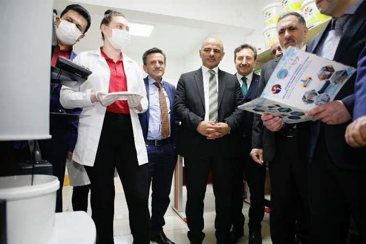 Okulun Kimya Teknolojisi Alanı Boya Üretim Tesisinde, piyasadaki ünlü markaların kalitesinde boya üretimi gerçekleştirildiği ve günlük kapasitenin 4 ton civarında olduğu ifade edildi.