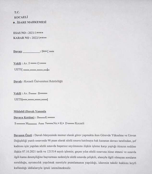 Kocaeli Üniversitesi Araştırma ve Uygulama Hastanesi kadrosunda bulunan E. Çırak, görevde yükselme sınavından 98 puan almasına karşın mülakatta elenmesi sonrasında yargıya başvurmuştu. Mahkeme görüntüleri izledikten sonra KOÜ’deki usulsüzlük tespit ederek, E.Çırak’ı haklı buldu.