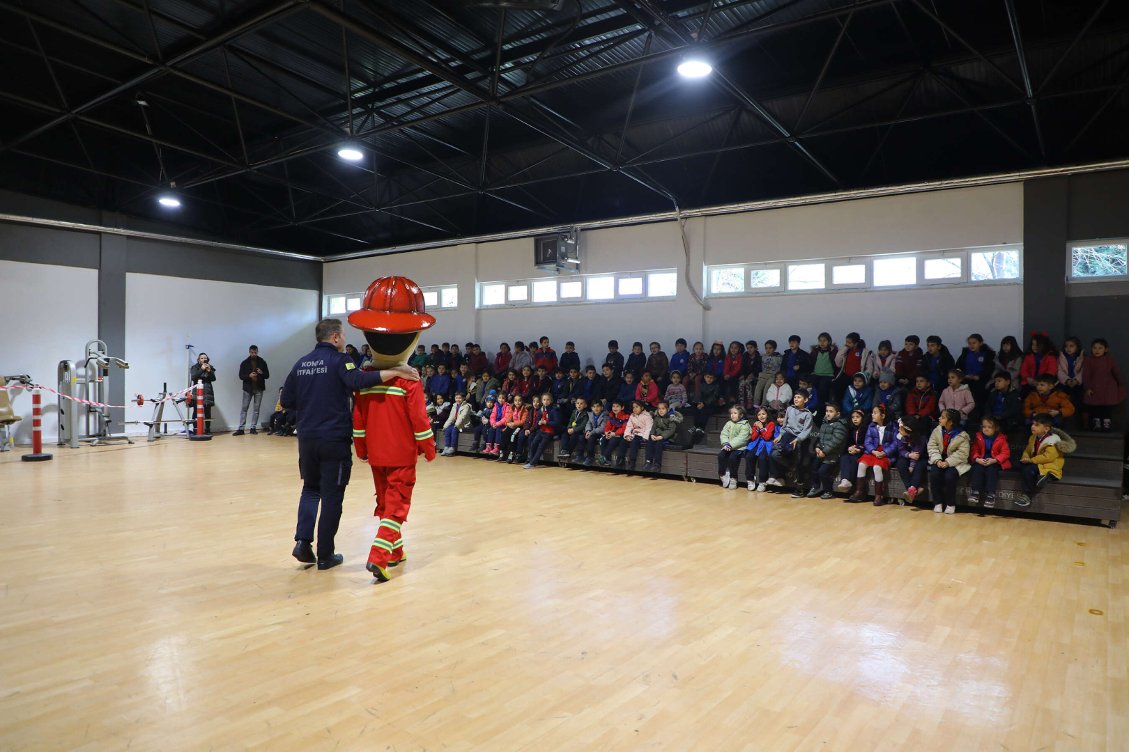 Verilen yangından korunma eğitimleri sonunda ise minik öğrencilere, Konya Büyükşehir Belediyesi Meslek Edindirme Kursları’na (KOMEK) bağlı Anatoya Oyuncak Atölyelerinde üretilen amigurumi itfaiye bebek ve peluş Konyaspor topları hediye ediliyor.