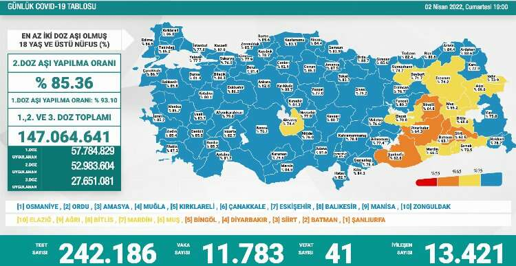 18 yaş ve üzeri nüfusun aşılanması verilerinde 1'inci doz Türkiye ortalaması yüzde 93,10, 2'nci doz ortalaması yüzde 85,36 olarak belirlendi. Ayrıca 1'inci dozda 57 milyon 784 bin 829, 2'nci dozda 52 milyon 983 bin 604 ve 3'üncü dozda 27 milyon 651 bin 081 olmak üzere 147 milyon 64 bin 641 aşı uygulandı.