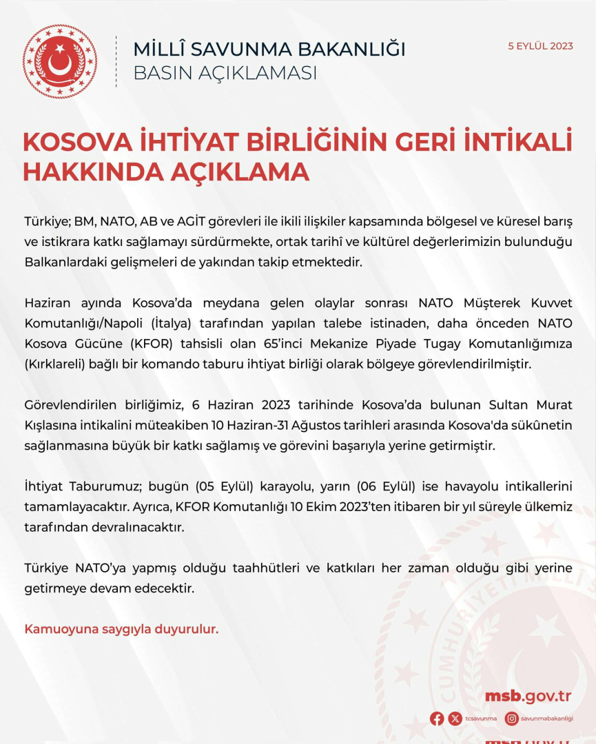 Milli Savunma Bakanlığı'ndan yapılan yazılı açıklamada, görevlendirilen komando taburunun Kosova'da bulunan Sultan Murat Kışlası’na 31 Ağustos'a kadar ülkede sükunetin sağlanmasına büyük bir katkı sağladığına dikkati çekerek, görevini yerine getirdiğini duyurdu.