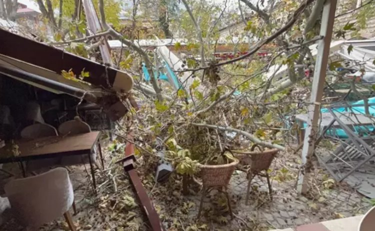 BURSA (İGFA) - Bursa’da lodos fırtınasıyla nedeniyle devrilen 250 yıllık anıt çınar ağacı lodosun etkisiyle devrildi. Olayda can kaybı yaşanmazken, Koza Han’ın avlusunda bulunan iş yerlerinde hasar meydana geldi.