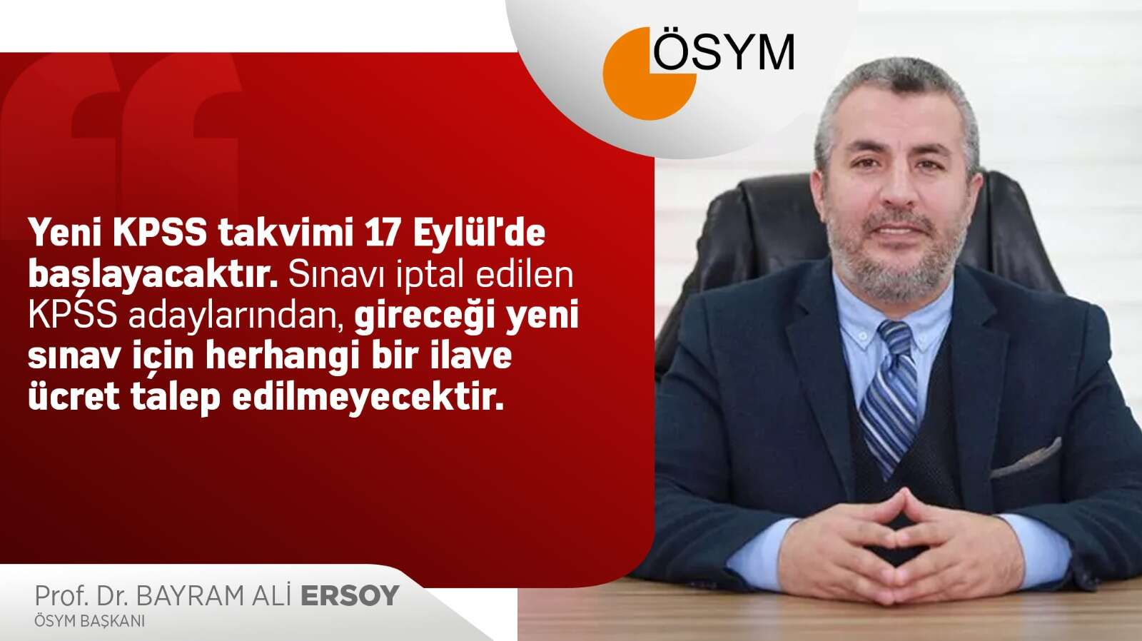 ÖSYM Başkanı Prof. Dr. Bayram Ali Ersoy, 31 Temmuz'da yapılan KPSS oturumlarının iptal edildiğini açıkladı. Ersoy, yeni takvimin 17 Eylül'de başlayacağını duyurdu