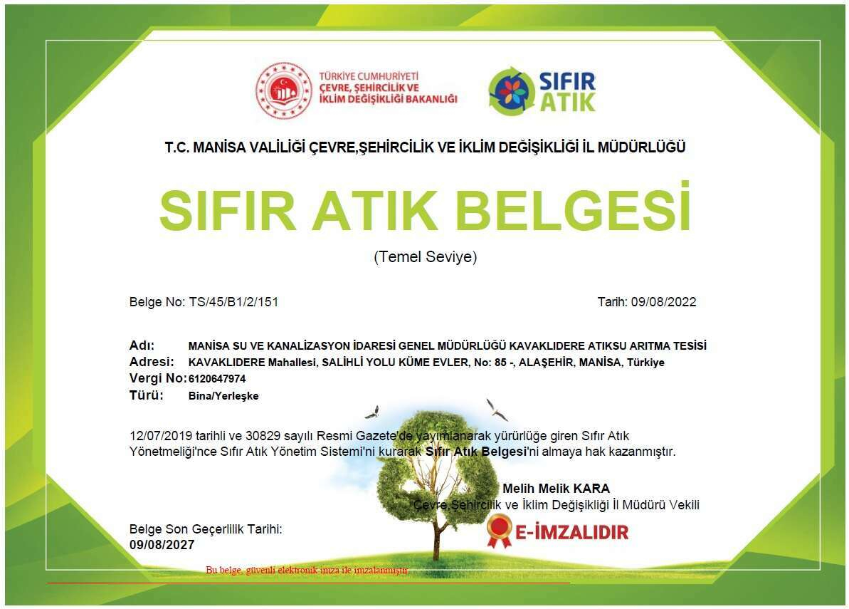 Manisa'da MASKİ Genel Müdürlüğünün 4 milyon 100 bin TL yatırım bedeli ile Alaşehir ilçesi Kavaklıdere Mahallesine kazandırdığı İleri Biyolojik Atıksu Arıtma Tesisi (AAT), Çevre, Şehircilik ve İklim Değişikliği Bakanlığı tarafından yürütülen “Sıfır Atık Projesi” kapsamında “Sıfır Atık Belgesi” almaya hak kazandı.