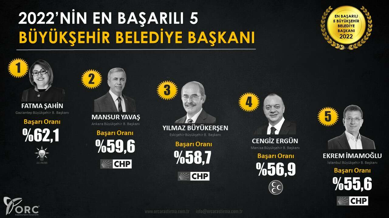 Çalışma sonucunda Gaziantep Büyükşehir Belediye Başkanı Fatma Şahin 1’inci, Ankara Büyükşehir Belediye Başkanı Mansur Yavaş 2’nci, Eskişehir Büyükşehir Belediye Başkanı Yılmaz Büyükerşen 3’üncü, Manisa Büyükşehir Belediye Başkanı Cengiz Ergün 4’üncü ve İstanbul Büyükşehir Belediye Başkanı Ekrem İmamoğlu 5’inci sırada yer aldı.