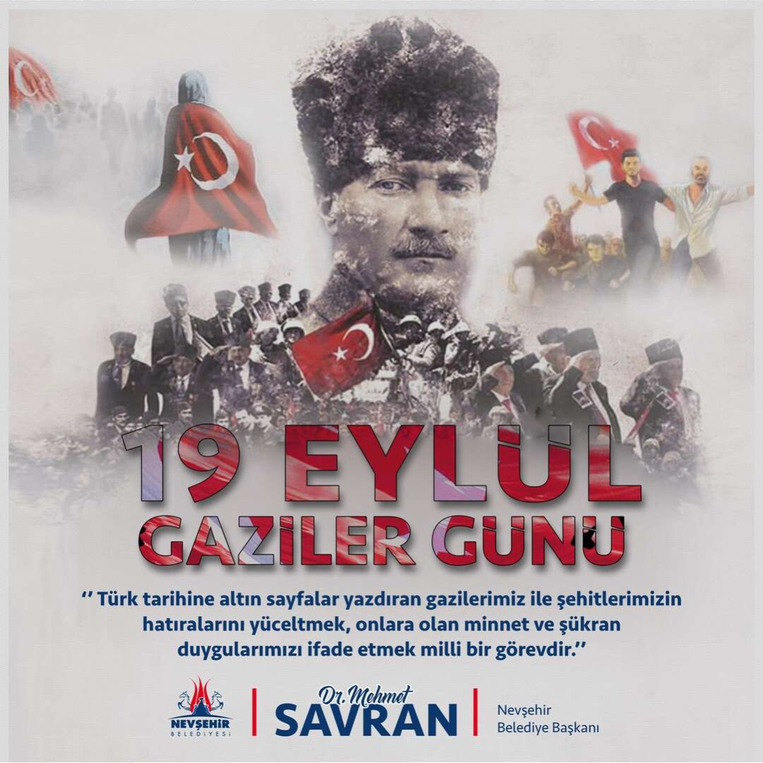 Nevşehir Belediye Başkanı Dr. Mehmet Savran, Türkiye Büyük Millet Meclisi tarafından Mustafa Kemal Atatürk’e Mareşal Rütbesi ve Gazilik unvanının verildiği 19 Eylül Gaziler Günü dolayısıyla bir mesaj yayımladı. Mesajında, vatanı, bayrağı ve kutsal değerleri uğruna canlarını ortaya koymaktan çekinmeyen gazilerimizin, milletimizin övünç kaynağı, vatanseverliğin ve kahramanlığın eşsiz timsali olduğunu belirten Savran, “Milli birlik ve beraberliğimizin korunması uğruna nice destanlar yazan gazilerimiz, şanlı tarihimizin ebedi kahramanlarıdır. Emsali olmayan bir fedakârlıkla hainlere göz açtırmayan, canlarından vazgeçmeyi göze alan gazilerimizle ne kadar iftihar etsek azdır “dedi.