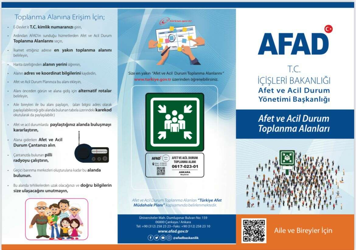 “Her bireyin adresine tanımlı toplanma alanı mevcut. T.C. kimlik numaranızla e-devlete giriş yapın. Ardından AFAD’ın sunduğu hizmetlerden Afet ve Acil Durum Toplanma Alanlarını seçin. İkamet ettiğiniz adrese en yakın toplanma alanını belirleyin. Sadece bugünlere özel olarak değil, deprem bilinci oluşturmak adına uygulamamız gerekenler arasında yer alan ve sürekli hazırda bulunması gereken deprem çantanızı mutlaka hazırlayın. Evinize yakın birden fazla toplanma alanı olabilir, bu yüzden afet durumunda aile bireyleri ile bir araya geleceğiniz toplanma alanını kararlaştırın.”