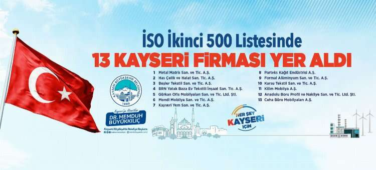 İstanbul Sanayi Odası’nın hazırladığı 2021 yılı İSO ikinci 500 listesinde yer alan 13 Kayseri firmasının yakaladığı başarı konusunda açıklamalarda bulunan Büyükşehir Belediye Başkanı Dr. Memduh Büyükkılıç, İSO ilk 500 ve İSO ikinci 500 listesi içerisinde yer alma başarı gösteren üretici ve çalışkan Kayseri’yi ‘başarı listelerinin gözdesi’ olarak niteleyerek, “Metal Matris San. ve Tic. A.Ş., Has Çelik ve Halat San. Tic. A.Ş., Beşler Tekstil San. ve Tic. A.Ş., BRN Yatak Baza Ev Tekstili İnşaat San. Tic. A.Ş., Gürkan Ofis Mobilyaları San. ve Tic. Ltd. Şti., Mondi Mobilya San. ve Tic. A.Ş., Kayseri Yem San. ve Tic. A.Ş., Parteks Kağıt Endüstrisi A.Ş., Formal Alüminyum San. ve Tic. A.Ş., Karsu Tekstil San. ve Tic. A.Ş., Kilim Mobilya A.Ş., Anadolu Boru Profil ve Nakliye San. ve Tic. Ltd. Şti. ve Ceha Büro Mobilyaları A.Ş.’yi başarılarından dolayı yürekten tebrik ediyorum, şehrimiz adına minnet duyuyorum, teşekkür ediyorum ve başarılarının devamını diliyorum” diye konuştu.