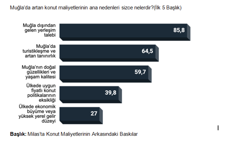 Konut fiyatlarındaki artışın başlıca nedenleri arasında dışarıdan gelen yerleşim talebi (yüzde 85,8), turistikleşme (yüzde 64,5) ve doğal güzelliklerin yarattığı baskı (yüzde 59,7) gösterildi. Çözüm olarak ise kira destekleri (yüzde 84,4), göç baskısının azaltılması (yüzde 78,7) ve yeni konut üretimi (yüzde 72,5) öne çıktı.