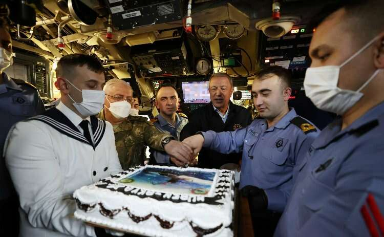Başarıyla gerçekleşen atış dolayısıyla hazırlanan pastanın Bakan Akar, Genelkurmay Başkanı Orgeneral Güler ve denizaltı personeli tarafından kesilmesinin ardından TCG PREVEZE limana döndü.