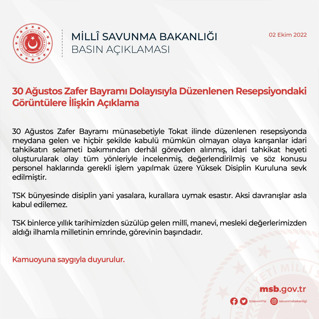 ANKARA (İGFA) - Tokat Valiliği tarafından 30 Ağustos resepsiyonunda 28 Şubat'ı andıran görüntüler meydana gelmişti. Sosyal medyada tepki çeken görüntülerde bir grup rütbeli askerin Cumhurbaşkanı'nı temsilen kenti yöneten Vali Numan Hatipoğlu'nun elini sıkmadan geçmesine ilişkin görüntüler ardından Milli Savunma Bakanlığı'ndan yazılı açıklama yapıldı.