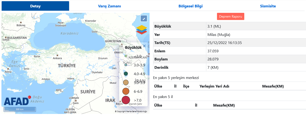 AFAD, Muğla’nın Milas ilçesinde 3,1 büyüklüğünde deprem meydana geldiğini duyurdu.