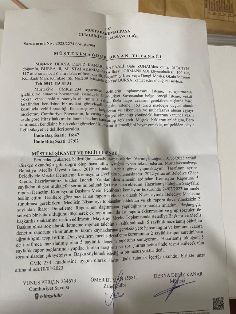 Mustafakemalpaşa Belediye Başkanı Mehmet Kanar’ın da, bilgisi dahilinde geliştiği, ancak göz yumduğunun ileri sürüldüğü denetleme raporu skandalıyla ilgili olarak, Derya Deniz Kanar’ın yaptığı suç duyurusunda aynen şu ifadelere yer verildi: “2019 yılından beri Mustafakemalpaşa Belediye Meclis Üyesiyim. Aynı zamanda Meclis Denetleme Komisyonu Üyesiyim. 2022 yılına ait Belediye gider raporu hazırlamamız tarafımızdan istendi. Yaptığımız denetlemenin ardından komisyon raporuna 5 saydan oluşan, muhalefet şerhimin bulunduğu ilave rapor ekledim. Hazırlamış olduğum bu 5 sayfalık raporu Denetim Komisyonu Başkanı Metin Pehlivan’a, komisyonun huzurunda 24-03-2023 tarihinde teslim ettim. Usullere göre hazırlanan raporun, eksiksiz olarak Nisan ayında belediye meclisine sunulması gerekirken, meclisin Nisan ayı toplantısında, ek raporum ilave edilmeksizin, sadece iki sayfalık denetim raporu dağıtımının yapıldığını gördüm. Başlangıçta sehven bir hata yapıldığını düşünerek ek raporumun da asıl rapora eklenmesini ve grup sözcüleri ile başkanlık makamına teslim edilmesini, mayıs ayı Belediye Meclisi toplantısında sözlü olarak beyan etmeme rağmen talebim karşılık bulmadı. 5 sayfalık hazırladığım raporumda, kamu kaynaklarının gereksiz yere harcandığını ve belediyenin, dolayısıyla kamunun zarara uğratıldığını tespit ettim. Dosyaya hem 2 sayfalık belediye meclis denetim raporunun suretini, hem de beş sayfalık denetleme raporumu sunuyorum. Yapılacak olan araştırma ve soruşturma neticesinde tespit edilecek tüm sorumlulardan şikayetçiyim.”