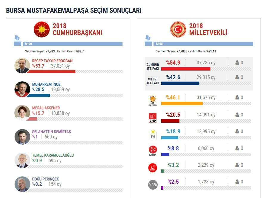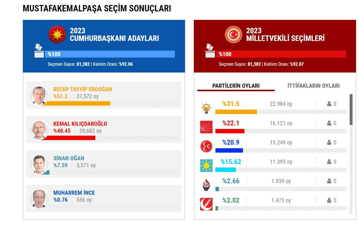 2018 Milletvekili Genel Seçimleri’nde ise Mustafakemalpaşa’da yüzde 46.1 oranıyla 31 bin 676 oy alan AK Parti, 2023 Milletvekili Genel Seçimleri’nde yüzde 31.5 oranla 22 bin 984 oy aldı.