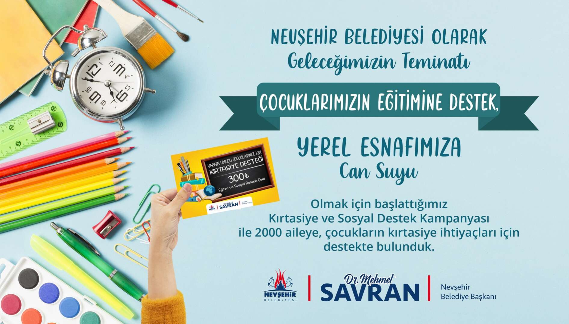 Eğitimin her kademesinde önemli yatırımlar yapan Nevşehir Belediyesi, geleceğimizin teminatı çocukları geleceğe en iyi şekilde hazırlamak için tüm imkanlarını seferber ediyor. Belediye Başkanı Dr. Mehmet Savran’ın talimatıyla geçtiğimiz yıl olduğu gibi bu yıl da eğitim sosyal destek paketiyle yeni eğitim öğretim dönemi öncesinde 300’er TL’lik 2 bin adet eğitim destek çekini uygulamaya sokan Nevşehir Belediyesi, yine hem esnafın hem de çocukların yüzünü güldürdü. İhtiyaç sahipleri, belediyeden aldıkları destek çekleriyle kampanyaya katılan küçük esnaftan gönüllerince alışveriş yaptılar.