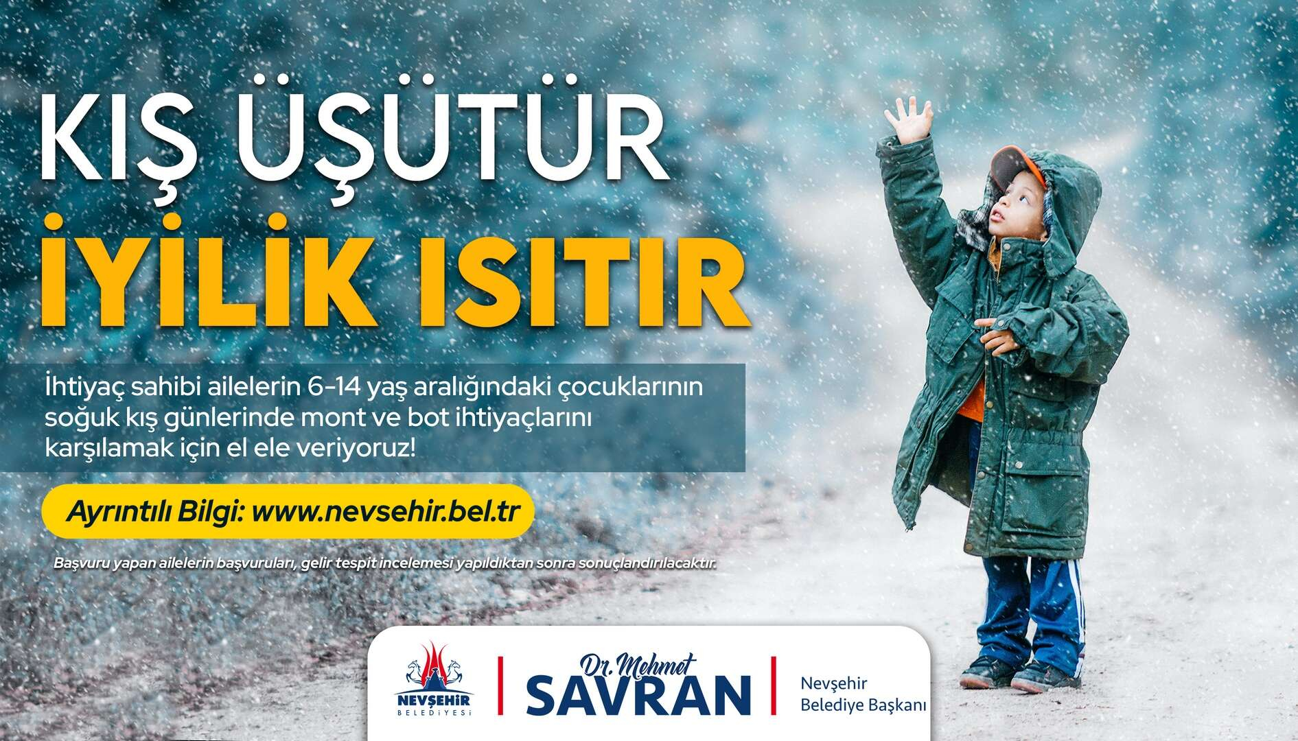 Nevşehir Belediyesi tarafından ihtiyaç sahibi dar gelirli ailelerin 6-14 yaş grubundaki çocukları için kışlık mont ve bot kampanyası başlatıldı. Yüzlerce çocuğun faydalanacağı kampanya için aileler başvurularını 21 Ekim Cuma gününe kadar www.nevsehir.bel.tr adresinden yapabilecek.