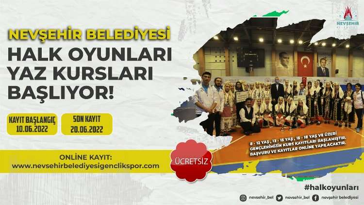 Nevşehir Belediyesi Gençlik ve Spor Hizmetleri Müdürlüğü tarafından 8-18 yaş grubu gençler için Halk Oyunları Kursu açılacak.