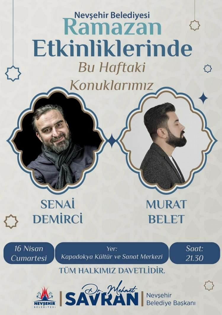 Nevşehir Belediyesi tarafından gerçekleştirilen Ramazan Etkinlikleri programının bu haftaki konukları ünlü ilahi sanatçısı Murat Belet ile yazar ve psikoterapist Senai Demirci olacak. Büyük ilgi görmesi beklenen program 16 Nisan Cumartesi akşamı Kapadokya Kültür ve Sanat Merkezi’nde yapılacak.