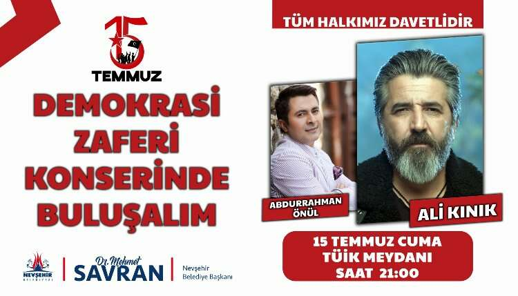 Abdurrahman Önül’ün Türk Tasavvuf Musikisi Konseri ile başlayacak olan programda hain darbe girişimini anlatan sinevizyon gösterileri dev ekrandan yayımlanacak. Saat 22.30'da ise saygı duruşunda bulunulup İstiklal Marşı okunacak. Ardından ise ünlü sanatçı Ali Kınık Nevşehirliler için unutulmaz bir konser verecek.