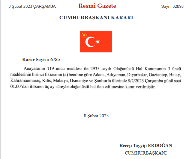Adana, Adıyaman, Diyarbakır, Gaziantep, Hatay, Kahramanmaraş, Kilis, Malatya, Osmaniye ve Şanlıurfa'nın olduğu 10 ilde 8 Şubat Çarşamba (bugün) saat 01.00 itibariyle başlayan 3 ay süreyle olağanüstü hal ilan edildi.