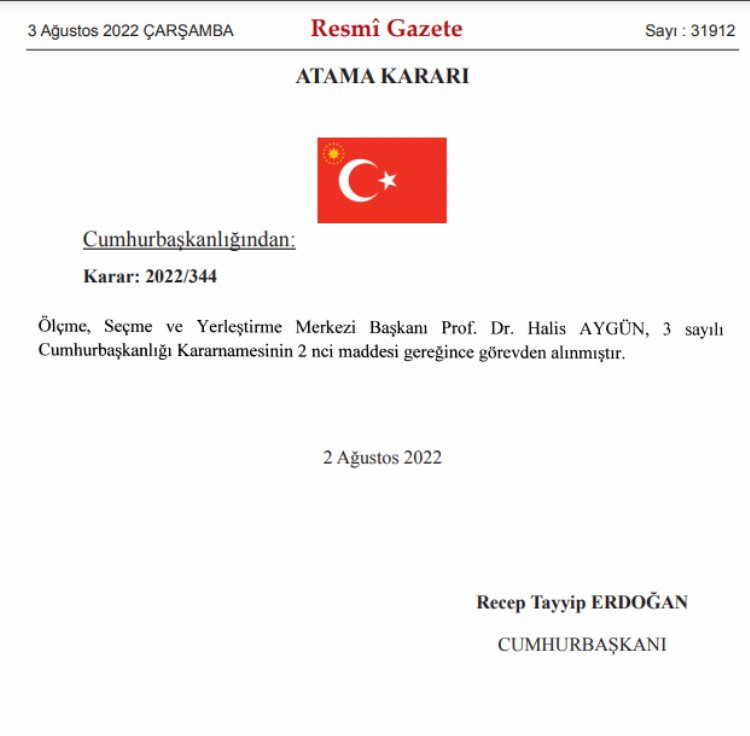 Ölçme, Seçme ve Yerleştirme Merkezi (ÖSYM) Başkanı Prof. Dr. Halis Aygün, Resmi Gazete'de yayımlanan Cumhurbaşkanlığı Kararı ile görevden alındı.