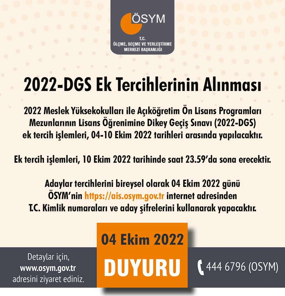 ANKARA (İGFA) - ÖSYM'nin internet sitesinde yer alan haberegöre, 2022-Meslek Yüksekokulları ile Açıköğretim Ön Lisans Programları Mezunlarının Lisans Öğrenimine Dikey Geçiş Sınavı (2022-DGS) ek tercih işlemlerinin bugünden itibariyle yapılmaya başlandığı kaydedildi.