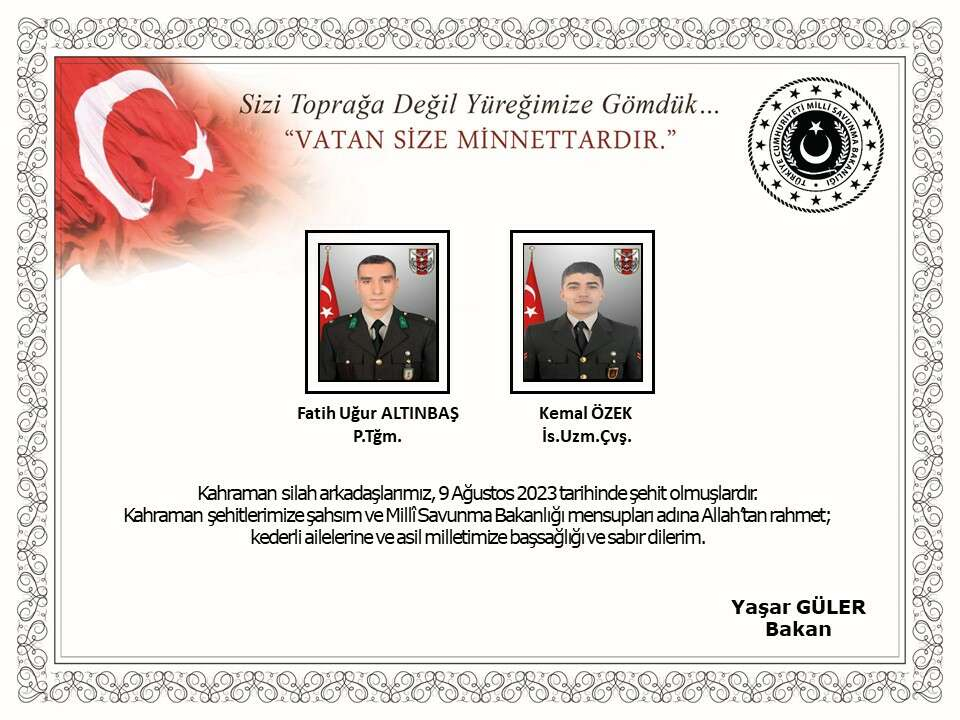 Bakanlıktan yapılan açıklamada, Pençe-Kilit Operasyonu bölgesinde, Bölücü Terör Örgütü mensupları tarafından açılan taciz ateşi sonrasında Piyade Teğmen Fatih Uğur Altınbaş ile İs. Uzman Çavuş Kemal Özek'in şehit olduğu, 3 kahraman silah arkadaşlarının da yararlandığı ve tedavileri için hastaneye sevk edildiği duyurulmuştu.