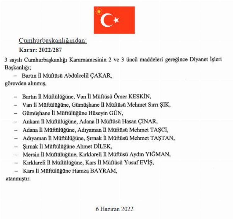Bartın Müftülüğü'ne Van Müftüsü Ömer Keskin, Van Müftülüğüne Gümüşhane Müftüsü Mehmet Sırrı Şık, Ankara Müftülüğü'ne Adana Müftüsü Hasan Çınar, Adana Müftülüğüne Adıyaman Müftüsü Mehmet Taşcı, Adıyaman Müftülüğüne Şırnak Müftüsü Mehmet Taştan, Mersin Müftülüğüne Kırklareli Müftüsü Aydın Yığman, Kırklareli Müftülüğüne Kars Müftüsü Yusuf Eviş'in ataması gerçekleştirildi.
