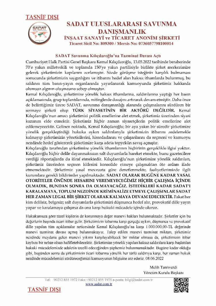 SADAT Uluslararası Savunma Danışmanlık şirketi CHP Genel Başkanı Kemal Kılıçdaroğlu'na 1 milyon liralık tazminat davası açtığı.