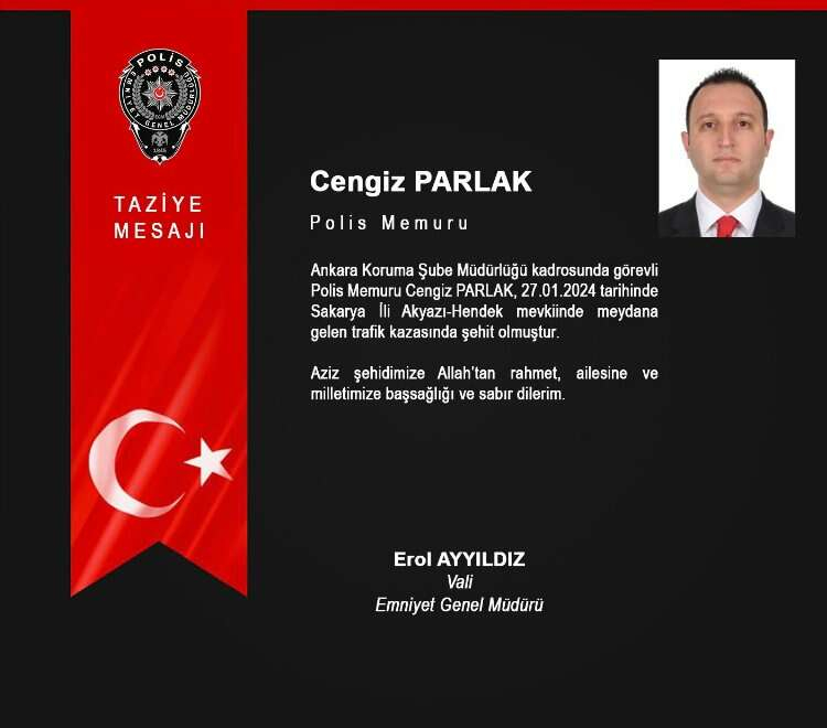 ANKARA (İGFA) - Sakarya’da görevi başında geçirdiği trafik kazası sonucu şehit düşen polis memuru Cengiz Parlak için Emniyet Genel Müdürlüğü'nden taziye mesajı yayımlandı.