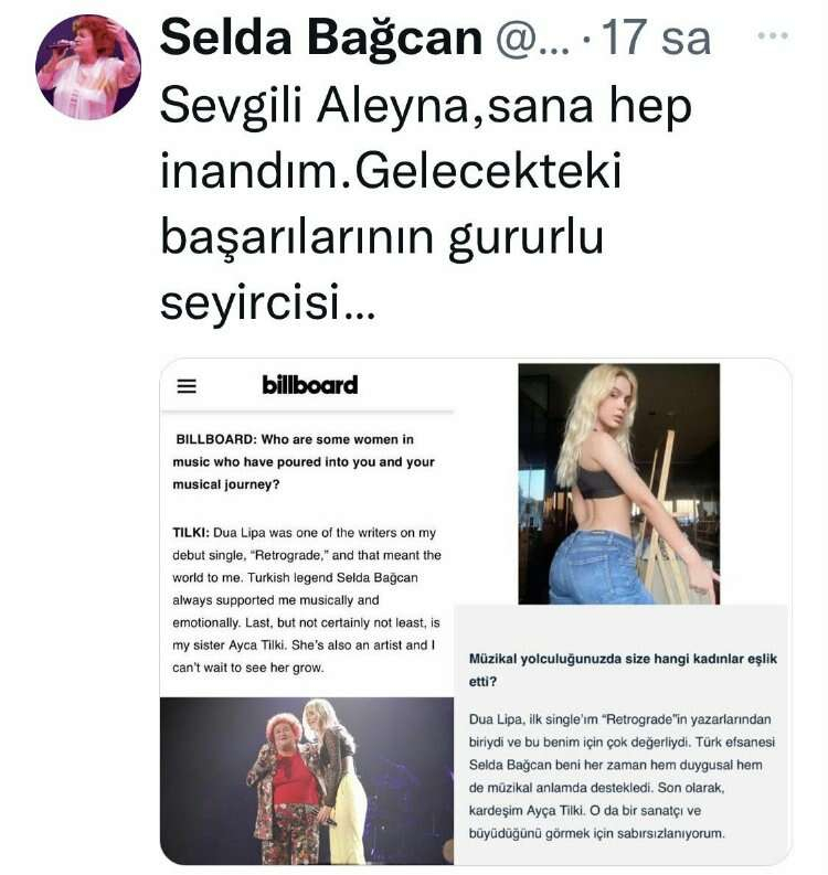 Billboard'a röportaj veren ilk Türk şarkıcı olan Aleyna Tilki dergide *Size ve müzikal yolculuğunuza katılmış olan müzikteki kadınlar kimler? sorusuna ‘Dua Lipa, ilk single'ım “Retrograde”nin yazarlarından biriydi ve bu benim için dünyalar demekti. Türk efsanesi Selda Bağcan beni her zaman müzikal ve duygusal olarak destekledi.’ diye verdiği cevap sonrası Selda Bağcan ‘da sosyal medyasından ‘Sevgili Aleyna, sana hep inandım. Gelecekteki başarılarının gururlu seyircisi…’ notunu paylaştı.