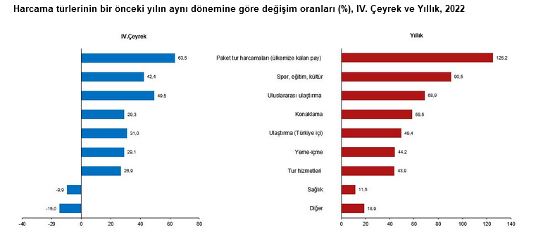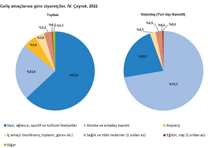 Türkiye'den çıkış yapan ziyaretçi sayısı son çeyreğin bir önceki yılın aynı çeyreği ile kıyaslandığında yüzde 32,4 artarak 11 milyon 978 bin 111 kişi oldu. Türkiye'den çıkış yapan ziyaretçi sayısı 2022 yılında bir önceki yıla göre yüzde 75 artarak 51 milyon 369 bin 26 kişi oldu. Ziyaretçilerin gecelik ortalama harcaması 86 dolar olurken, geceleme yapan yurt dışında ikamet eden vatandaşların gecelik ortalama harcaması ise 58 dolar olarak gerçekleşti.