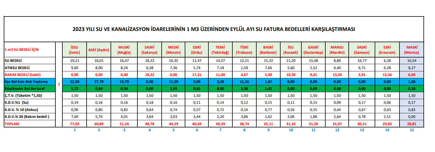 MASKİ’den yapılan bilgilendirmede Eylül ayı su fatura bedelleri karşılaştırmasında 15. sırada yer aldığının altı çizildi.