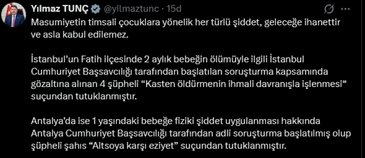 İstanbul’un Fatih ilçesinde 2 aylık bir bebeğin ölümüyle ilgili başlatılan soruşturma kapsamında gözaltına alınan 4 şüphelinin, “Kasten öldürmenin ihmali davranışla işlenmesi” suçundan tutuklandığını duyuran Bakan Tunç, Antalya’da ise 1 yaşındaki bir bebeğe uygulanan fiziki şiddet olayında adli soruşturma başlatıldığı ve şüpheli kişinin “Altsoya karşı eziyet” suçundan tutuklandığı açıkladı.