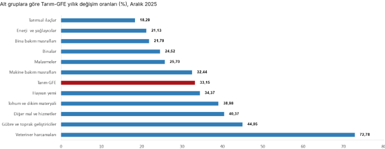 TÜİK'in Aralık 2025 verilerine göre Tarım-GFE yıllık yüzde 33,15 yükselirken, veteriner harcamaları yüzde 72,78'lik rekor artışla tarım üreticilerini en çok zorlayan kalem oldu. Aylık artış ise yüzde 1,30 seviyesinde kaldı.