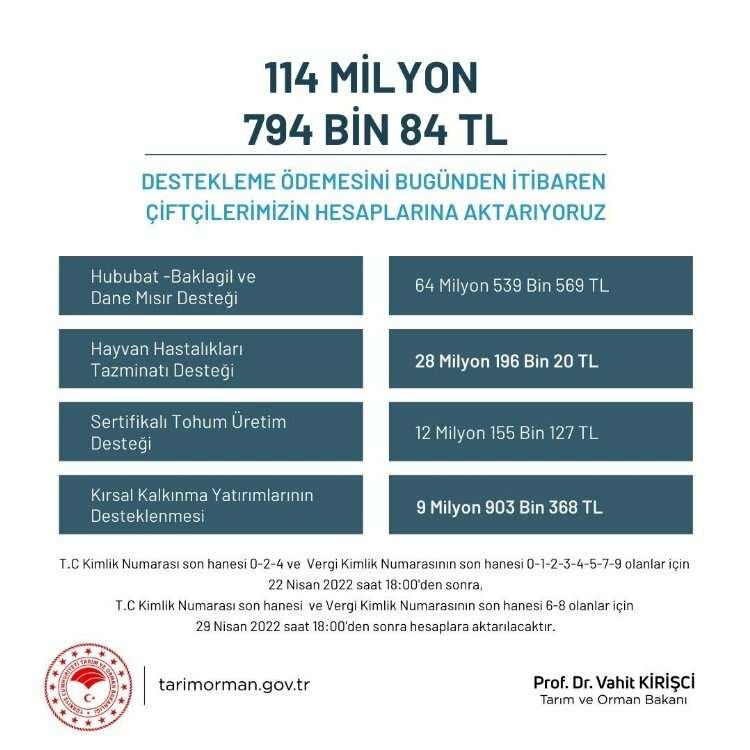 Çiftçilere tarımsal destek ödemeleri kapsamındaki yeni ek destekte; Hububat-Baklagil ve Dane Mısır Desteği için 64 milyon 539 bin 569 lira, Hayvan Hastalıkları Tazminatı Desteği için 28 milyon 196 bin 20 lira, Sertifikalı Tohum Üretim Desteği için 12 milyon 155 bin 127 lira, Kırsal Kalkınma Yatırımlarının Desteklenmesi için 9 milyon 903 bin 368 liranın üreticilerin hesaplarına aktarılmaya başlandığını, TC Kimlik Numarası ve Vergi Kimlik Numarası son hanesi 6-8 olanların 29 Nisan'da hesaplara yatırılacağı bildirildi.