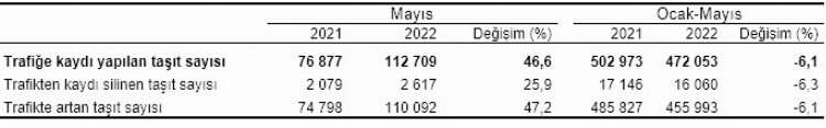 Mayıs ayında trafiğe kaydı yapılan taşıt sayısı bir önceki aya göre, traktörde yüzde 8,3, özel amaçlı taşıtta yüzde 7,3, motosiklette yüzde 3,2 ve minibüste yüzde 2,2 artarken otobüste yüzde 48,7, kamyonda yüzde 22,8, kamyonette yüzde 14,6 ve otomobilde yüzde 10,2 azaldı.