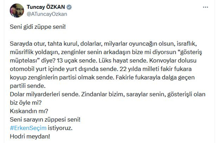 Hatırlanacağı gibi Tuncay Özkan, Cumhurbaşkanı Erdoğan'a "Seni gidi züppe seni" diyerek erken seçim isteğini sosyal medya hesabından yaptığı paylaşımla dile getirmişti.