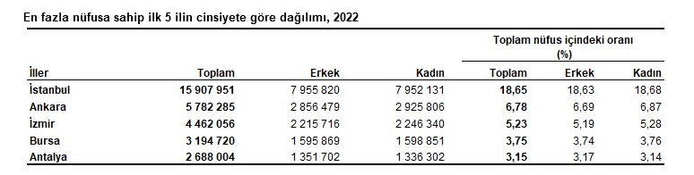İstanbul'un nüfusu, bir önceki yıla göre 67 bin 51 kişi artarak 15 milyon 907 bin 951 kişi oldu. Türkiye nüfusunun ,65'inin ikamet ettiği İstanbul'u, 5 milyon 782 bin 285 kişi ile Ankara, 4 milyon 462 bin 56 kişi ile İzmir, 3 milyon 194 bin 720 kişi ile Bursa ve 2 milyon 688 bin 4 kişi ile Antalya izledi.