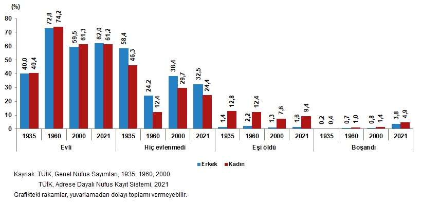 Ülkemizde yıllara ve cinsiyete göre medeni durumun dağılımı incelendiğinde, erkeklerde hiç evlenmeyenlerin oranının kadınlara göre daha yüksek olduğu, kadınlarda ise eşi ölenlerin ve boşananların oranının erkeklerden daha fazla olduğu görüldü.